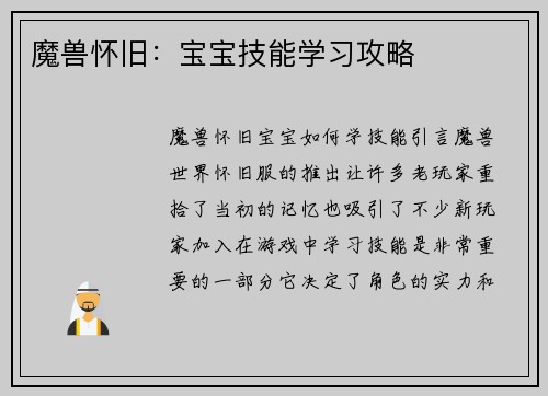 介绍 作为魔兽世界中的猎人职业,宠物是猎人的重要组成部分。在怀旧服中,猎人的宠物外观技能可以为玩家带来更多的个性化选择。本文将详细介绍如何在魔兽怀旧服中更换猎人宠物的外观技能,包括宠物外观技能的获取途径、选择宠物外观的因素以及一些实用的技巧和建议。 获取宠物外观技能 在魔兽怀旧服中,猎人可以通过多种...